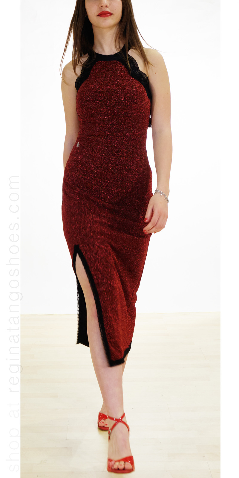 Io mi chiamo ''Creme Brulee 13", sono un abito realizzato in lurex rosso e bordi in pizzo nero.