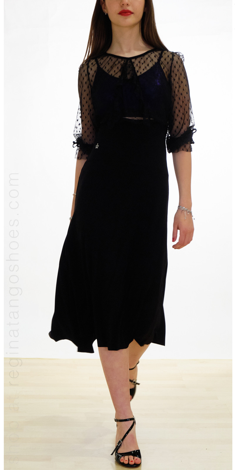 Io mi chiamo ''Granatina club 01' sono un abito realizzato in due diversi tessuti: nella parte alta ho un morbido tulle a cuoricini con effetto camicetta BON TON, la gonna, invece, è realizzata in morbidissimo jersey nero.