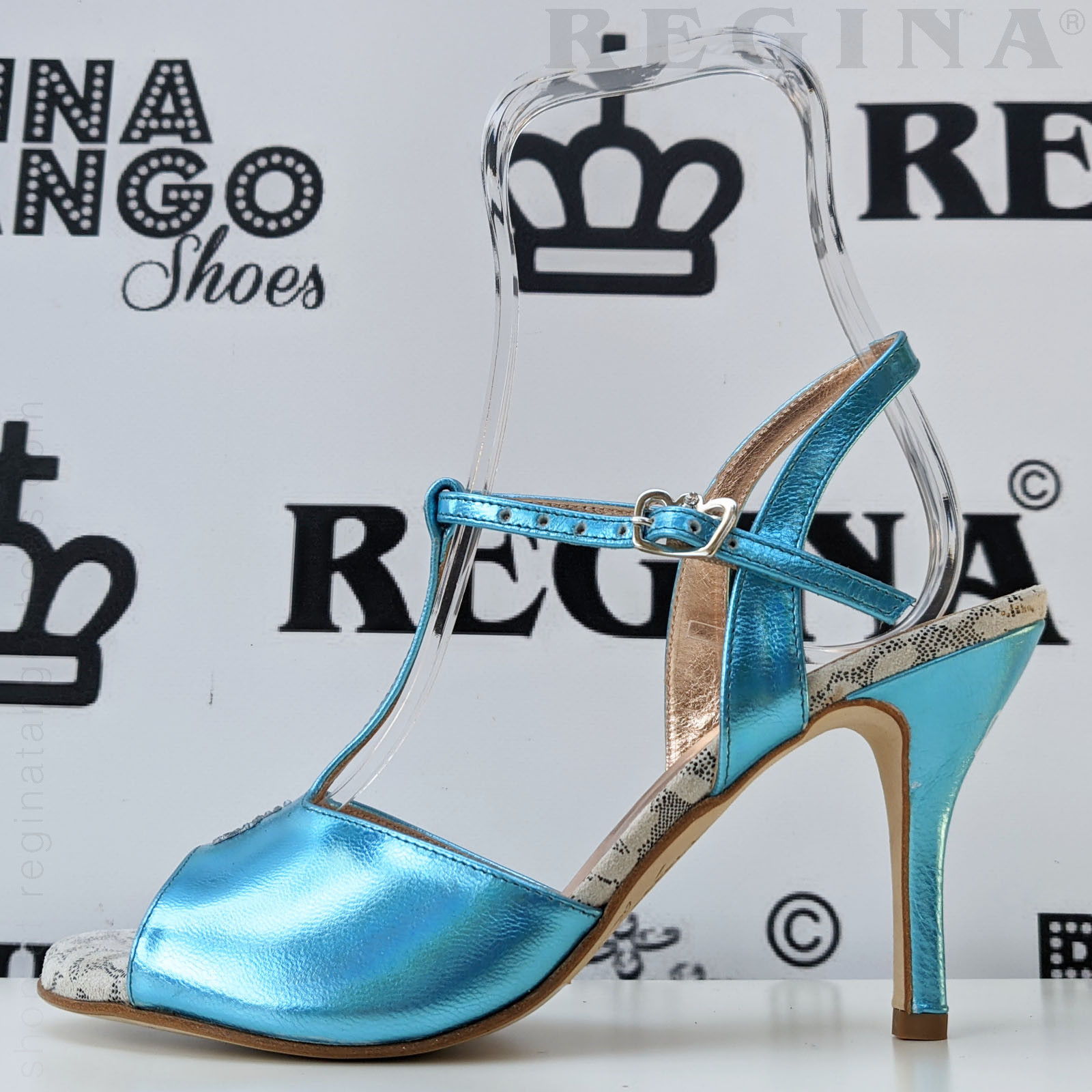 Le REGINA® sono nate per il Tango Argentino e per i balli da sala in genere, ma sono talmente comode che sono perfette anche per le grandi occasioni o semplicemente da indossare ogni giorno grazie alla comodità di una morbida imbottitura brevettata e la morbidezza del cuoio pomiciato della suola non va utilizzata in caso di pioggia.Il modello Amelia 545 è realizzato in pelle laminata color tiffany con puntina poggiadita e profilino in camoscio stampato pizzo.