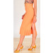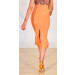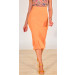 Io mi chiamo ''Cocco'', sono realizzata in morbido tessuto jersey elasticizzato colore arancio. La mia linea è diritta e cucito all'orlo finale, ho un facione svasato che crea un simpatico e frizzante movimento mentre ballo. Sul centro dietro della gonna ho un elegante spacco e sopra di esso una bellissima e minimale arricciatura. Realizzato con i migliori materiali italiani. La Maison Regina consiglia di abbinarmi con le scarpe modello