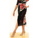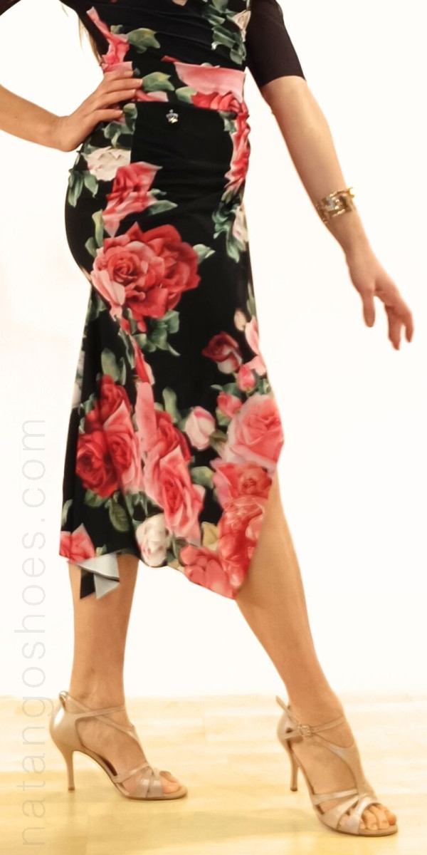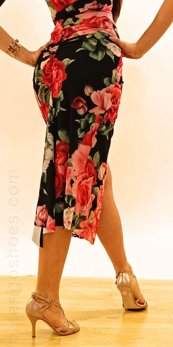 Io mi chiamo ''Nanà'', sono una gonna di vestibilità aderente realizzata in lycra fantasie rosa con fondo nero. Nella parte davanti, uno strato di jersey si sovrappone all'altro, formando uno spacchettino nel centro davanti, un effetto davvero originale ed elegante! Sul fianco sinistro ho un inserto in pizzo nero e arricciatura nel centro dietro.