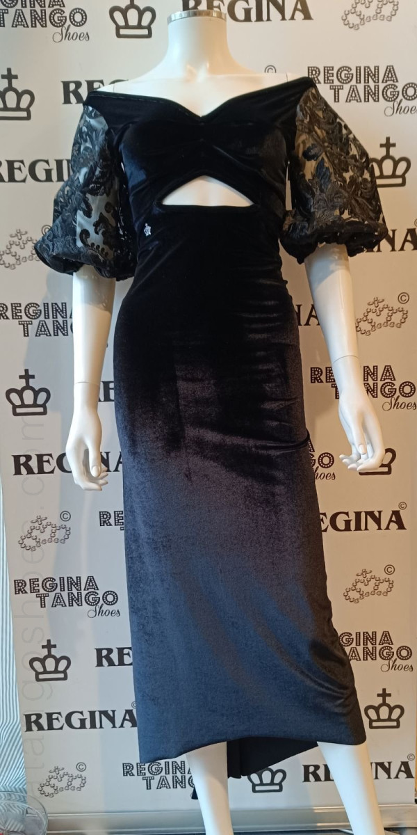 Abito realizzato in velluto nero e pizzo nelle maniche