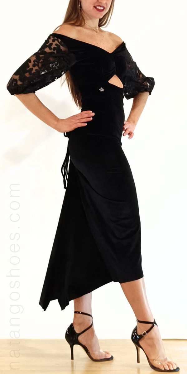 Abito realizzato in velluto nero e pizzo nelle maniche