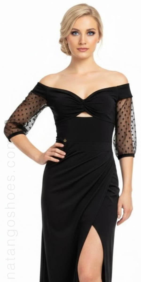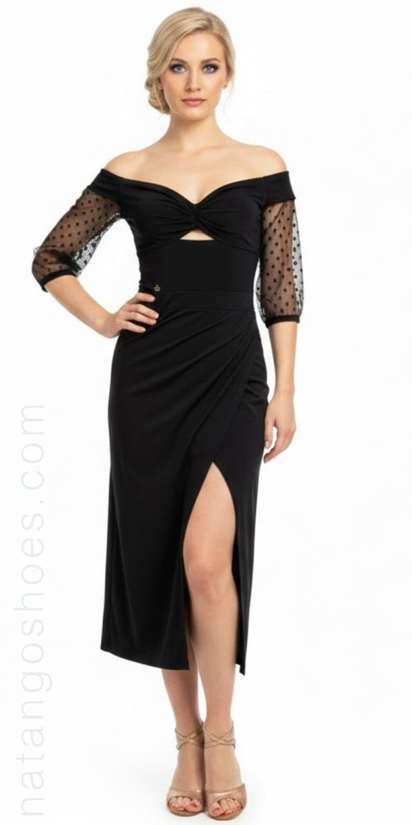 T-shirt realizzata in jersey elasticizzato nero e tulle a pois nelle maniche