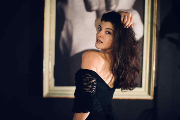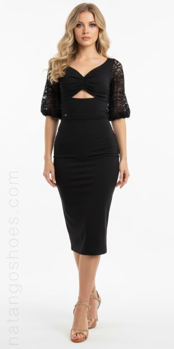 Abito realizzato in jersey elasticizzato nero e pizzo nero nelle maniche