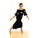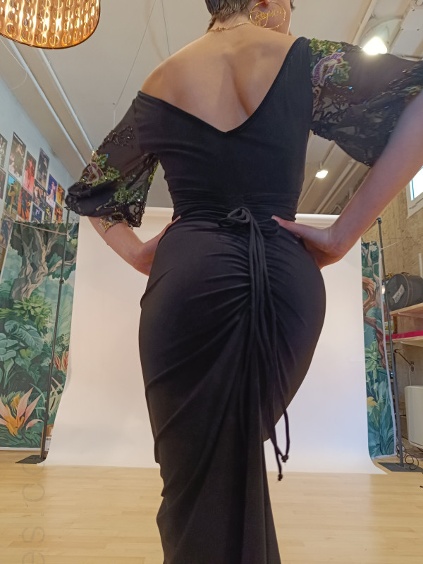 Abito realizzato in jersey nero e tulle ricamato a fiori nelle maniche