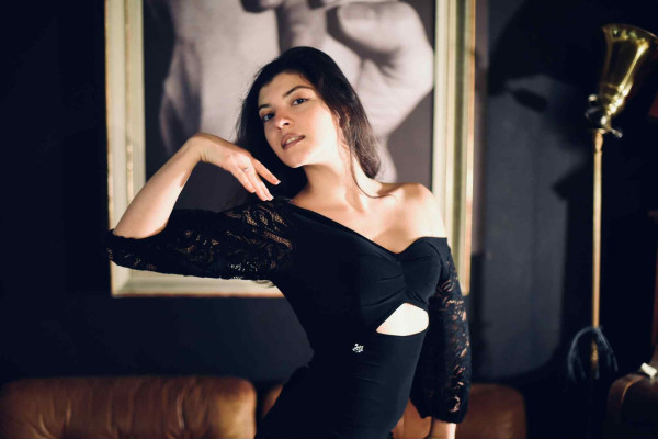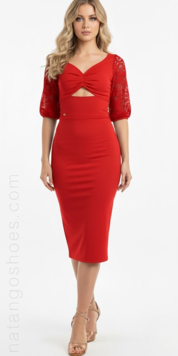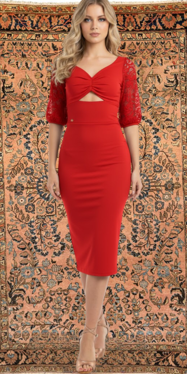 Abito realizzato in jersey elasticizzato rosso e pizzo rosso nelle maniche