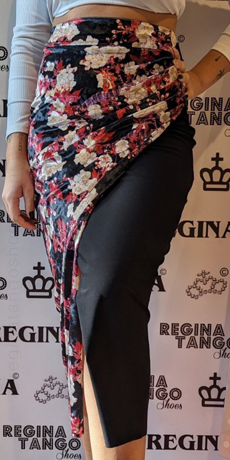 Io mi chiamo ''Ananas'', sono una gonna di vestibilità aderente realizzata in velluto fantasia fiori di ciliegio e jersey nero. Nella parte davanti, uno strato di jersey si sovrappone all'altro, formando uno spacchettino nel centro davanti, un effetto davvero originale ed elegante! Sul fianco sinistro ho una leggera arricciatura che crea delle pieghette verso il centro.