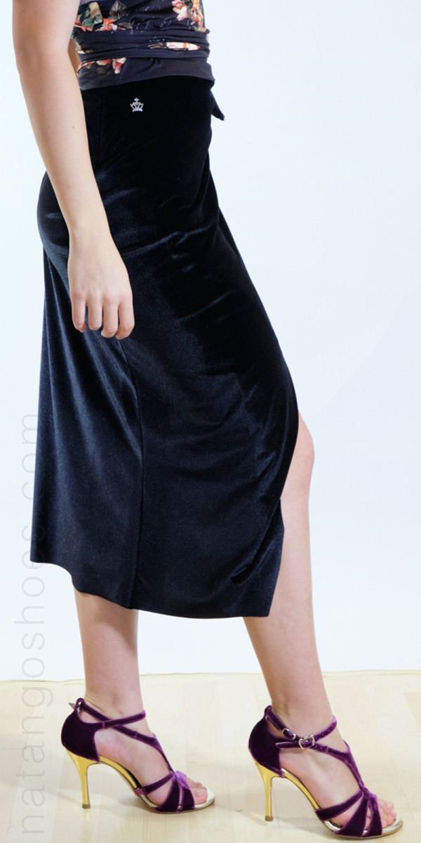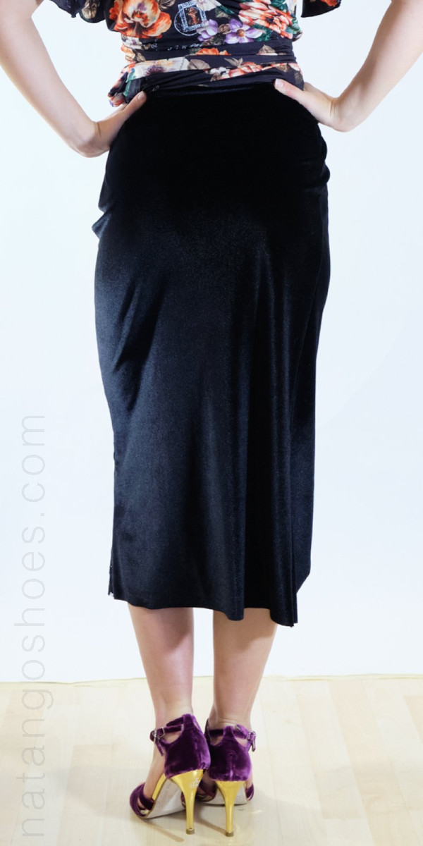 Io mi chiamo ''Ananas'', sono una gonna di vestibilità aderente realizzata interamente in velluto elasticizzato nero e pizzo nero. Nella parte davanti, uno strato di velluto si sovrappone all'altro, formando uno spacchettino nel centro davanti, un effetto davvero originale ed elegante! Sul fianco sinistro ho una leggera arricciatura che crea delle pieghette verso il centro. Realizzata con i migliori materiali italiani.